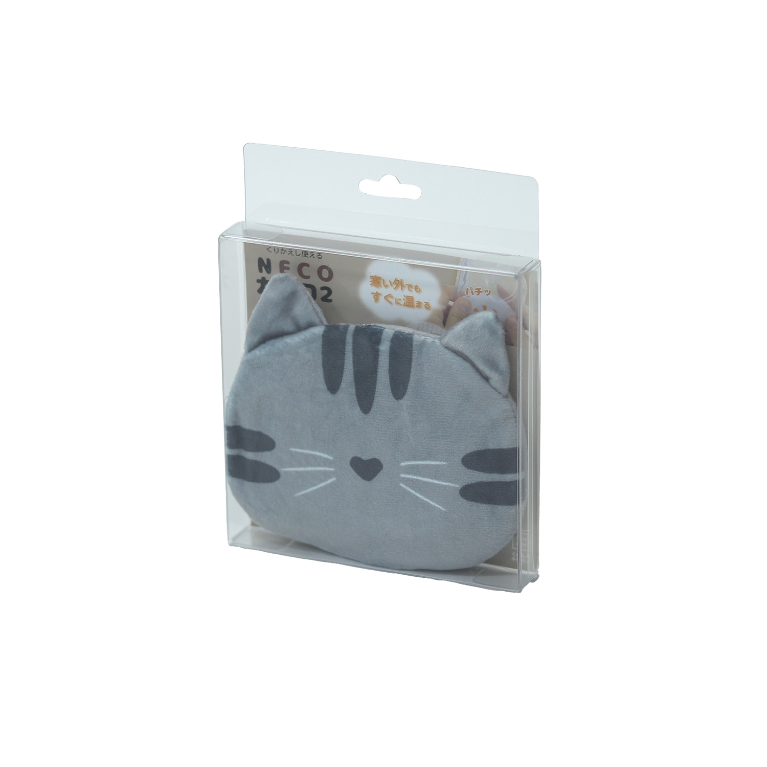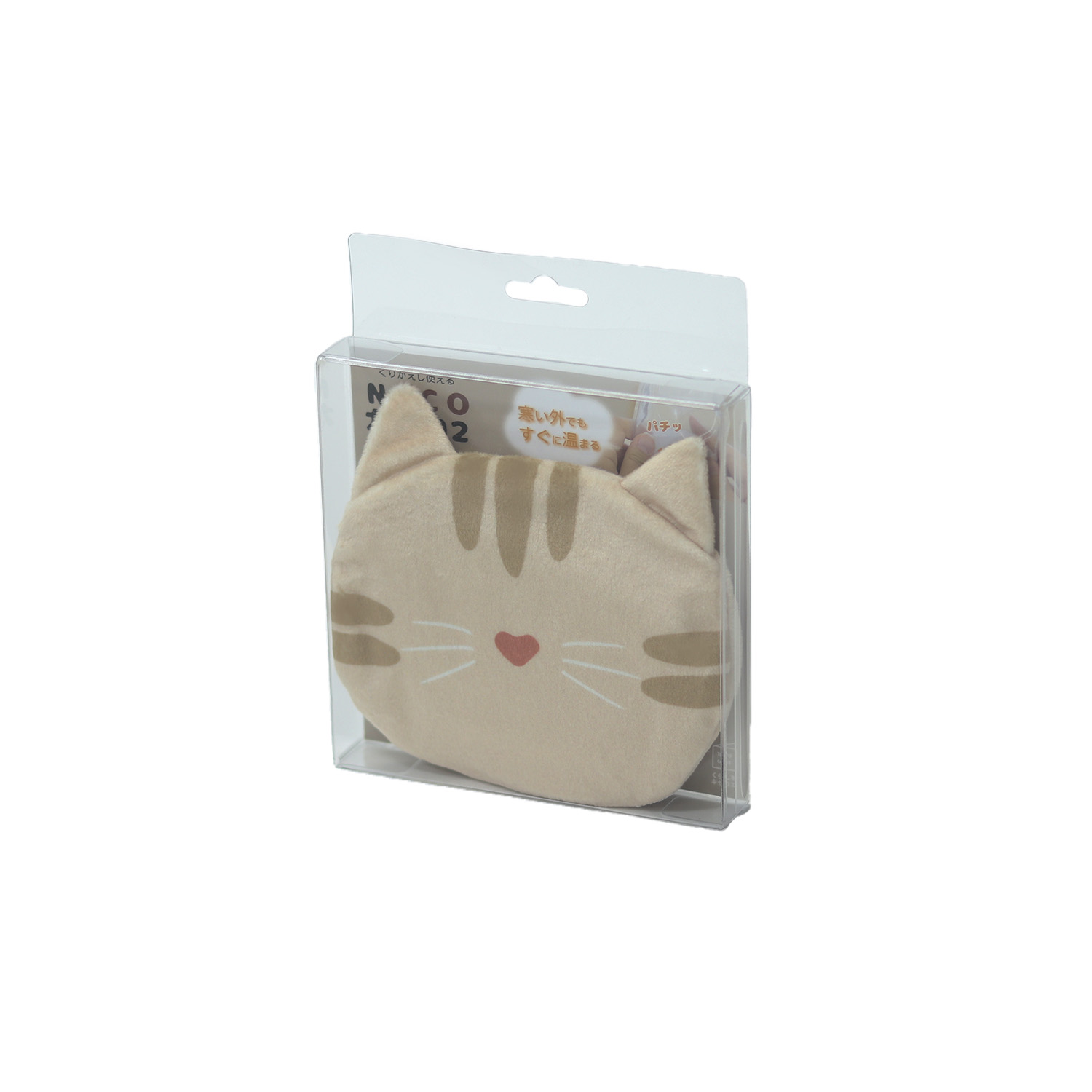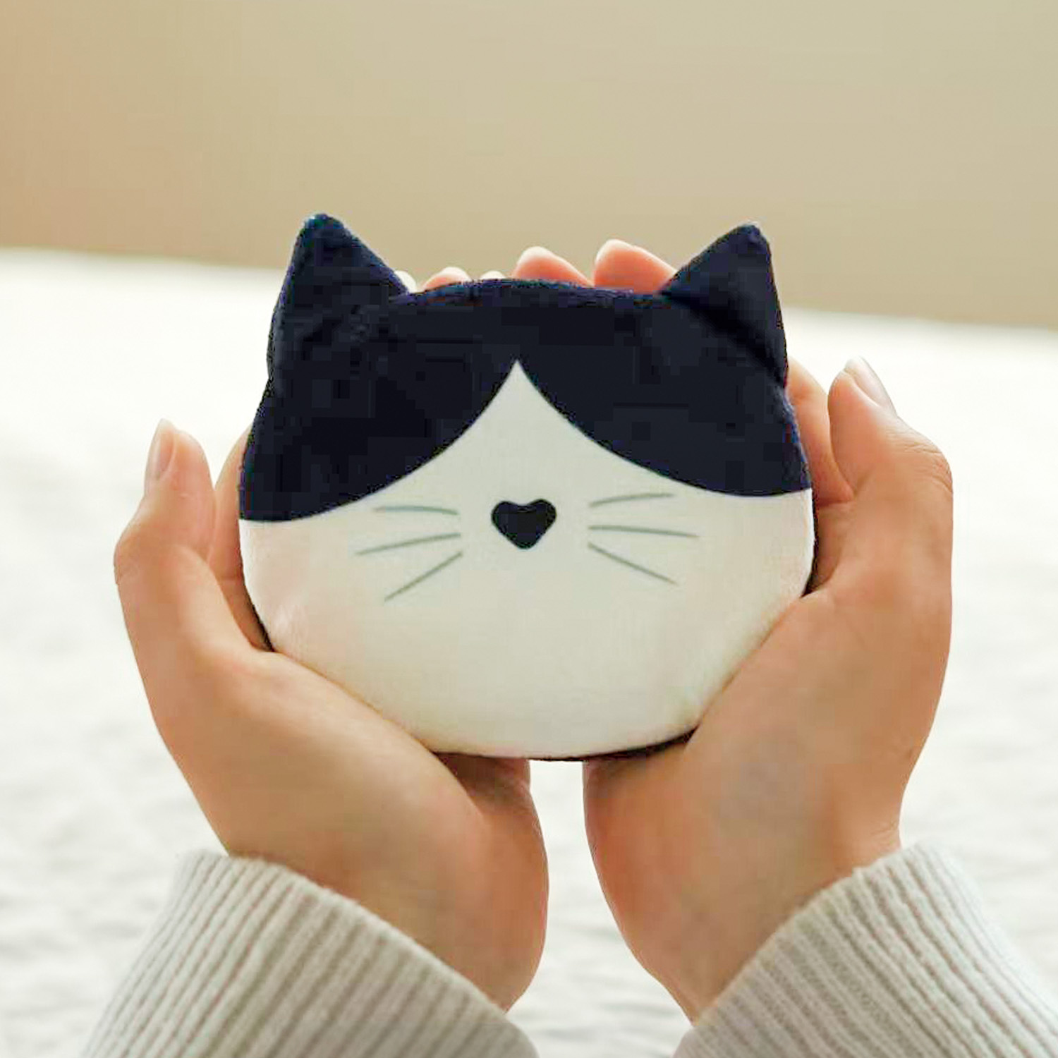 可愛い猫の顔に手も心も温めるカイロ。繰り返し使えるカイロとカバーのセットです。