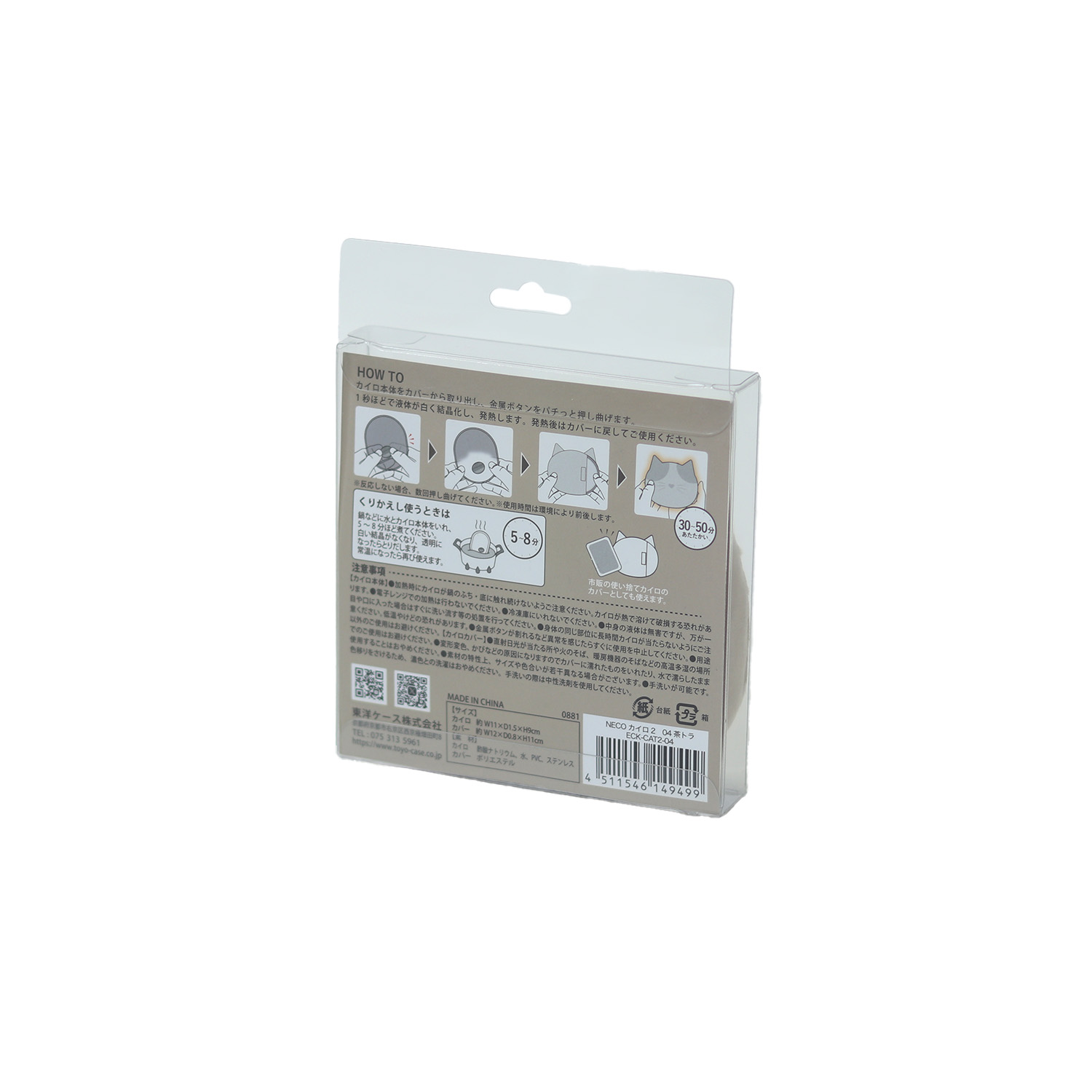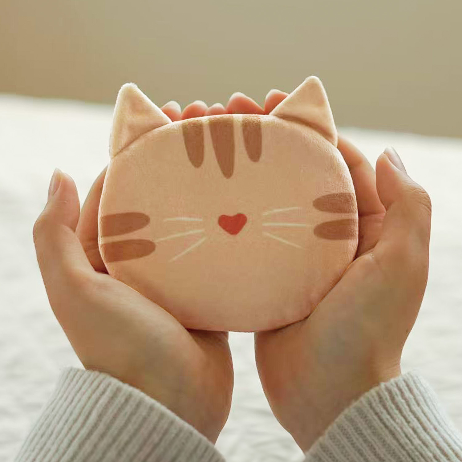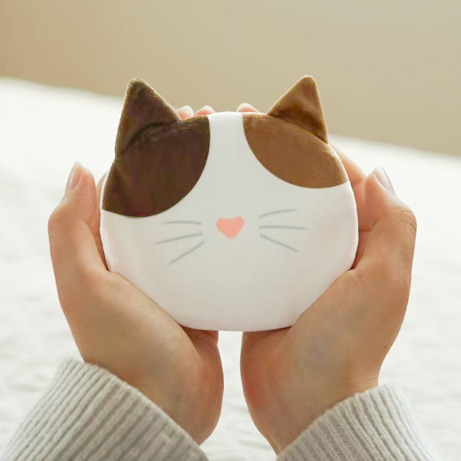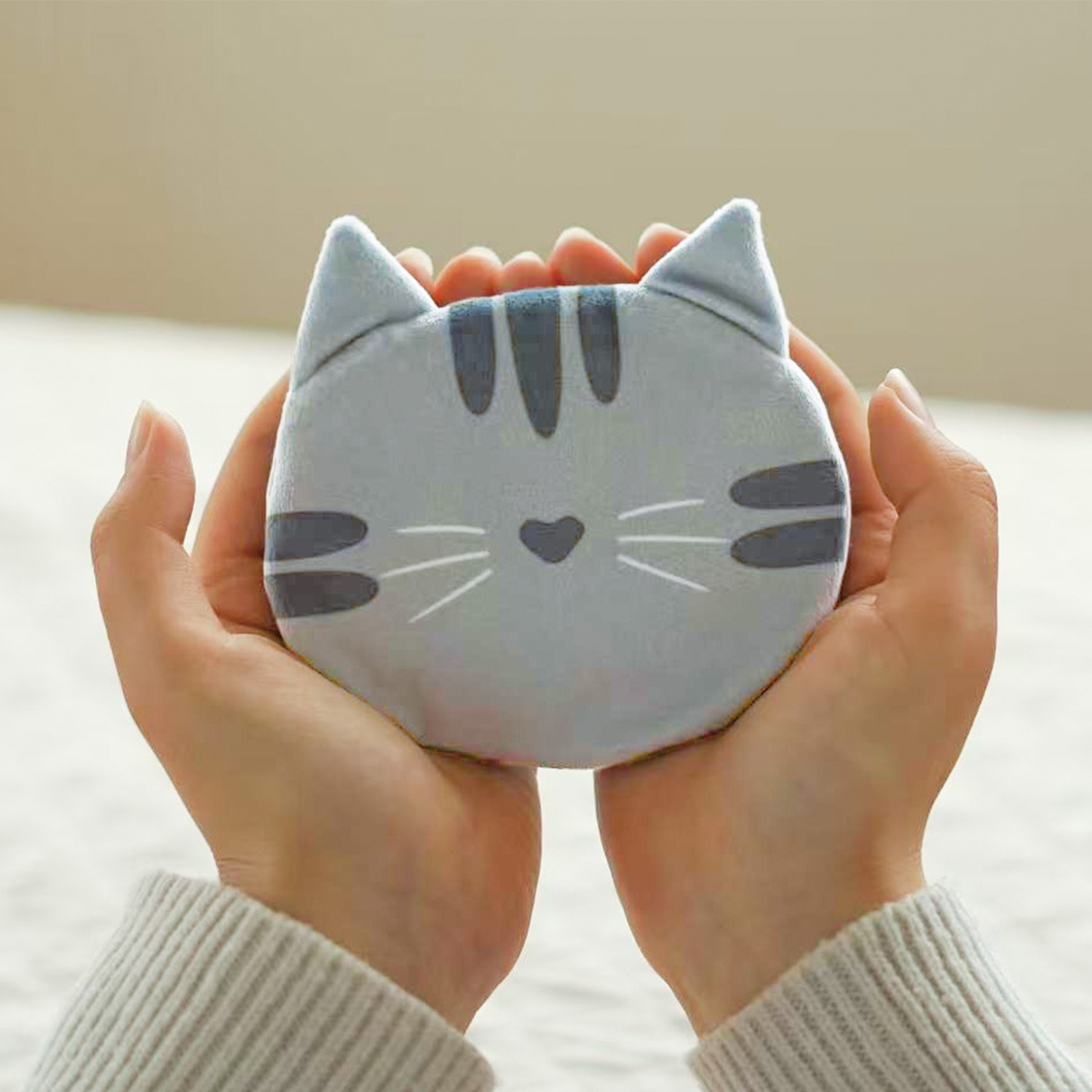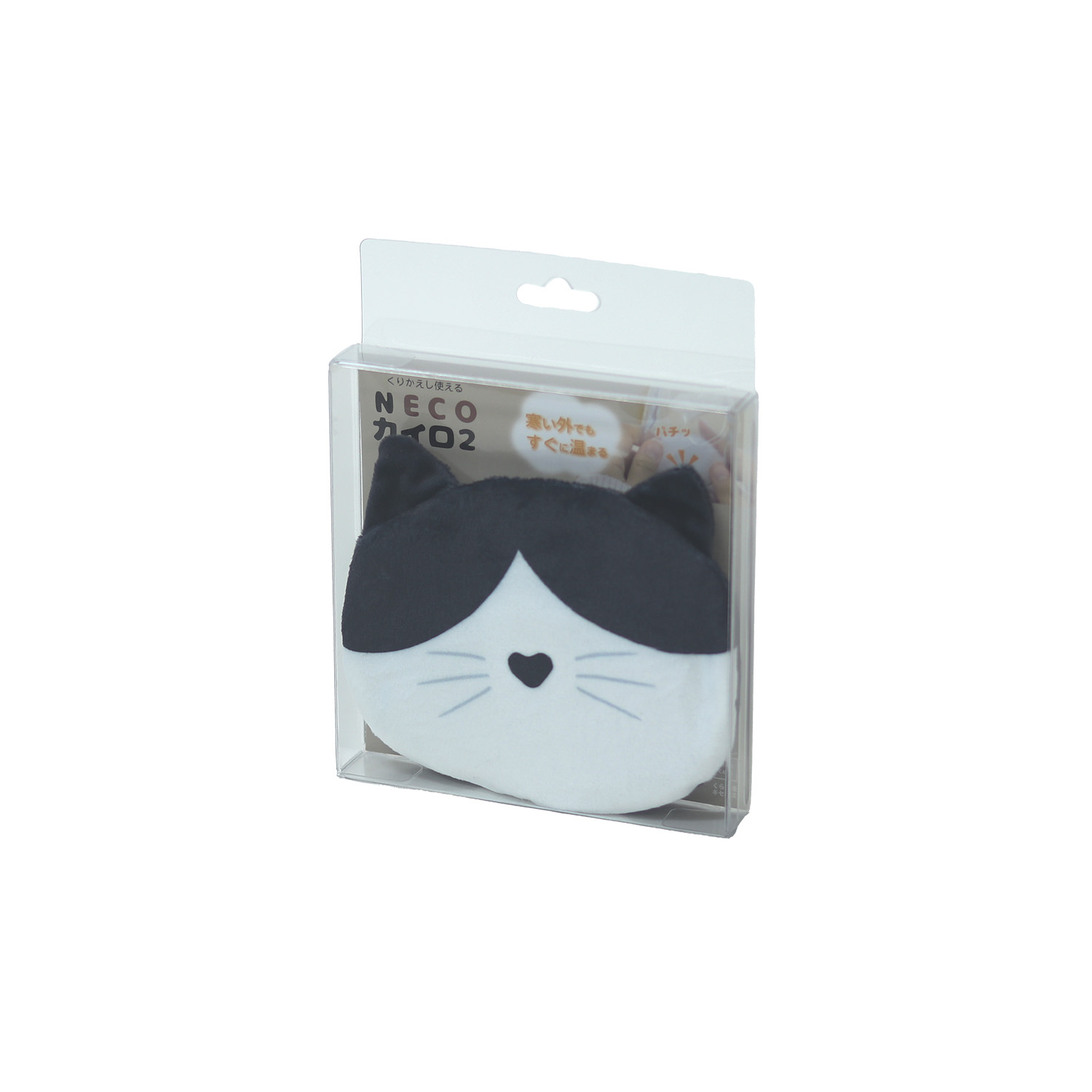 可愛い猫の顔に手も心も温めるカイロ。繰り返し使えるカイロとカバーのセットです。