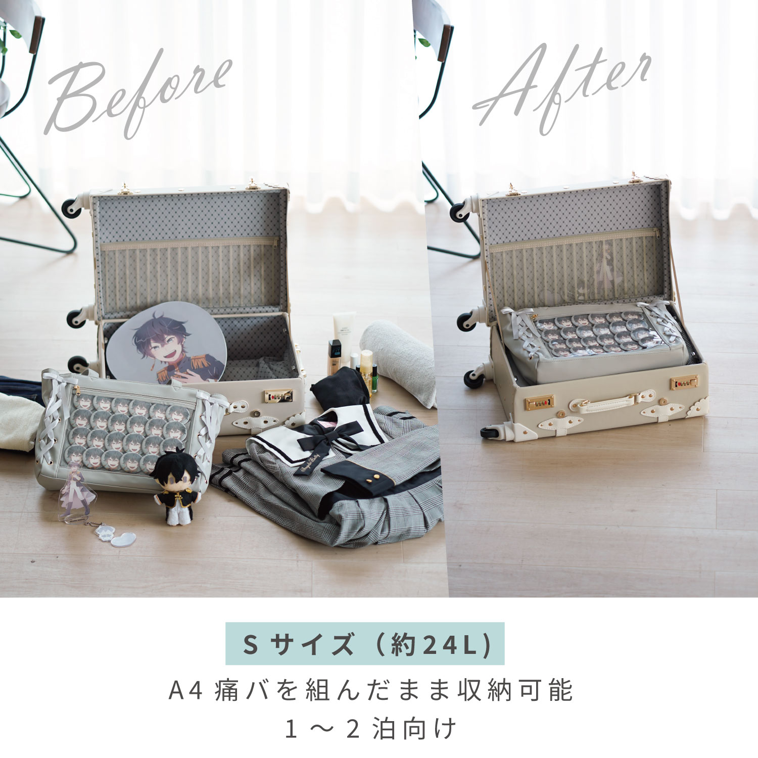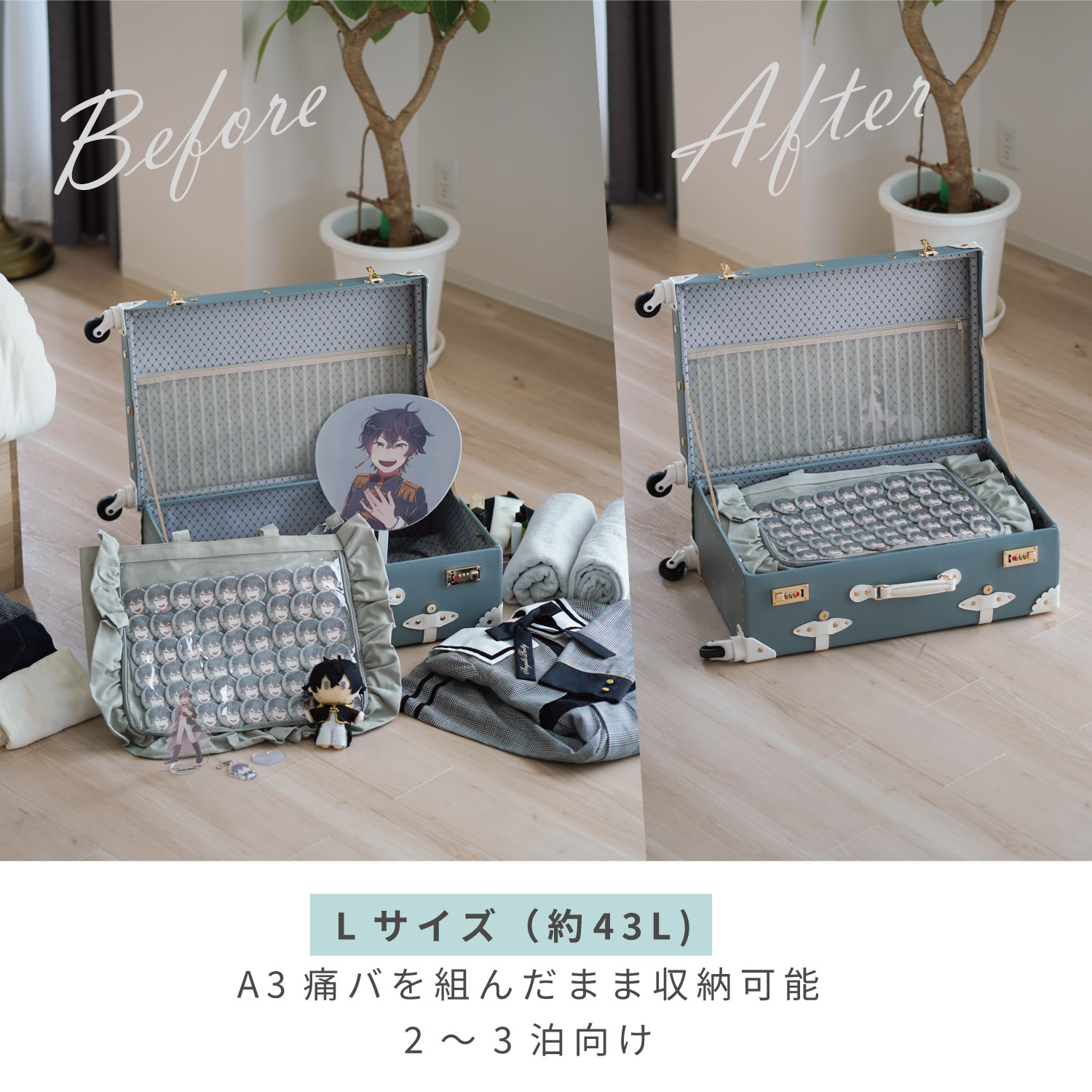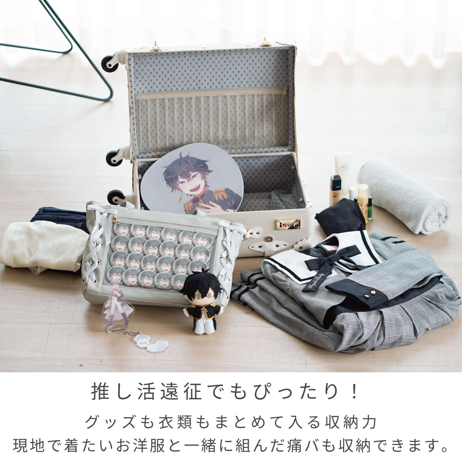 現地で着たい衣類と推しグッズをまとめて収納できます。