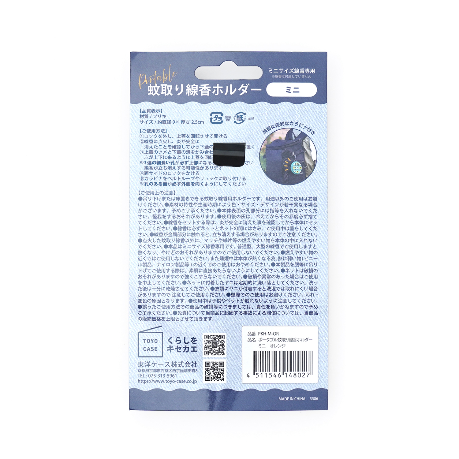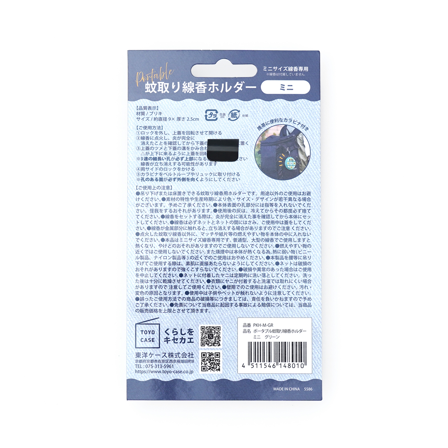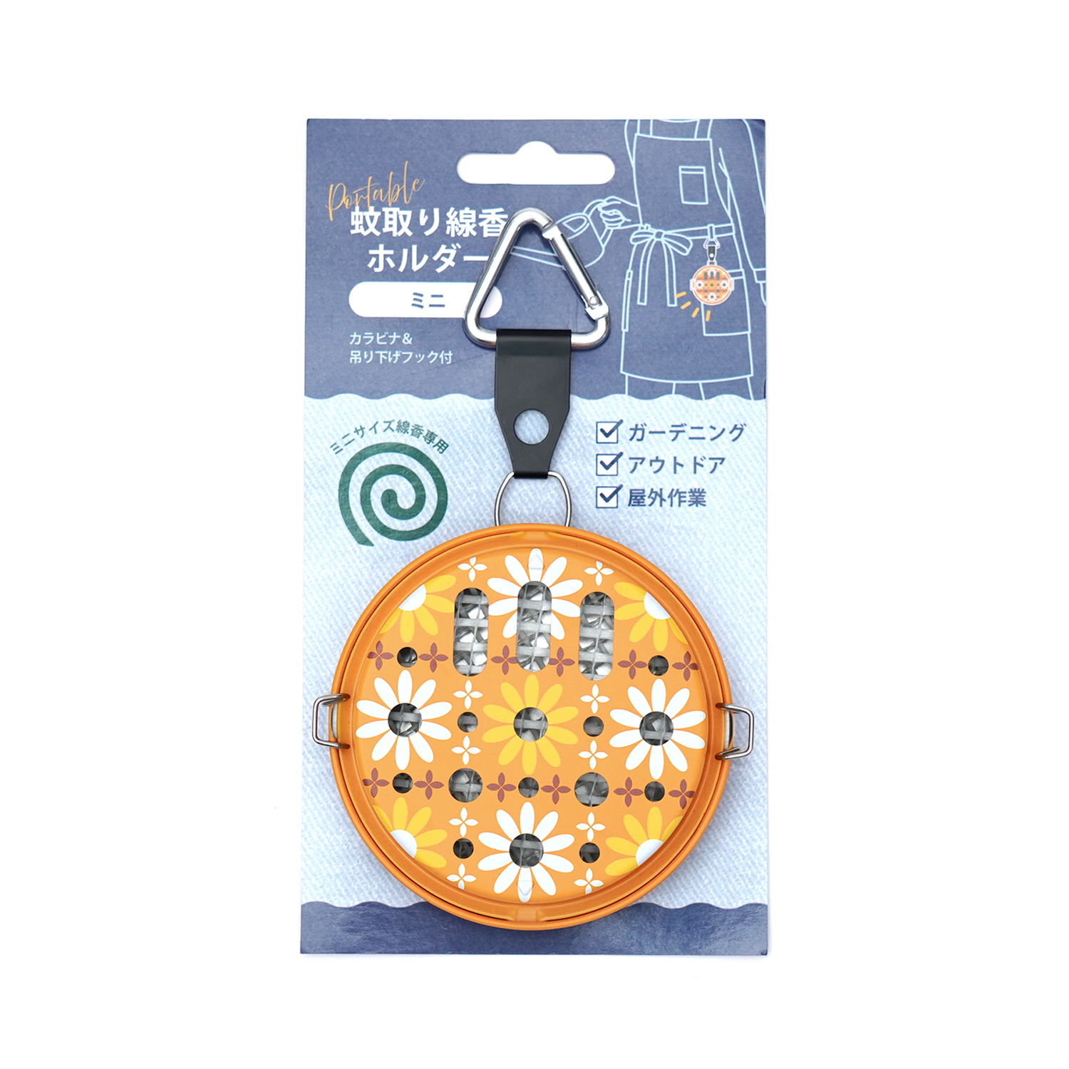 ズボンのベルトやリュック、玄関先に吊下げて使用できる蚊取り線香ホルダー。
