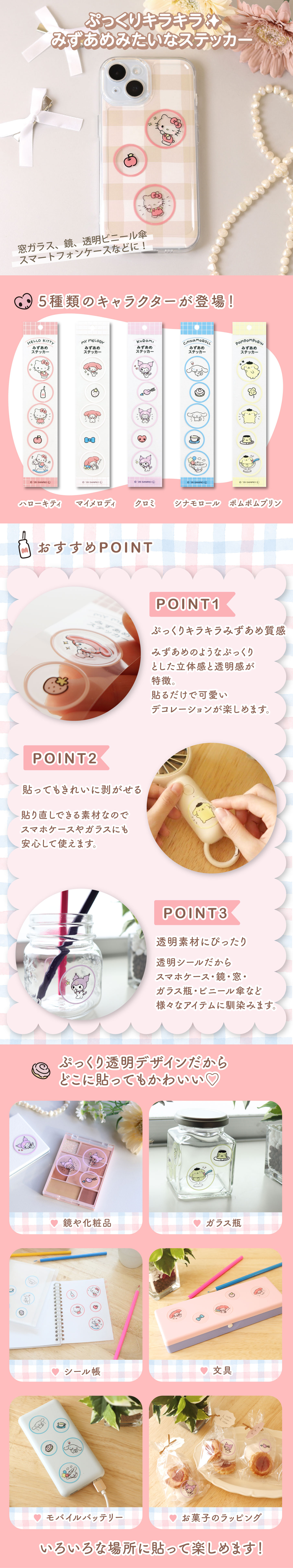 サンリオキャラクターズのみずあめステッカーは、ぷっくりとした立体感と透明感がかわいいクリアステッカーです。